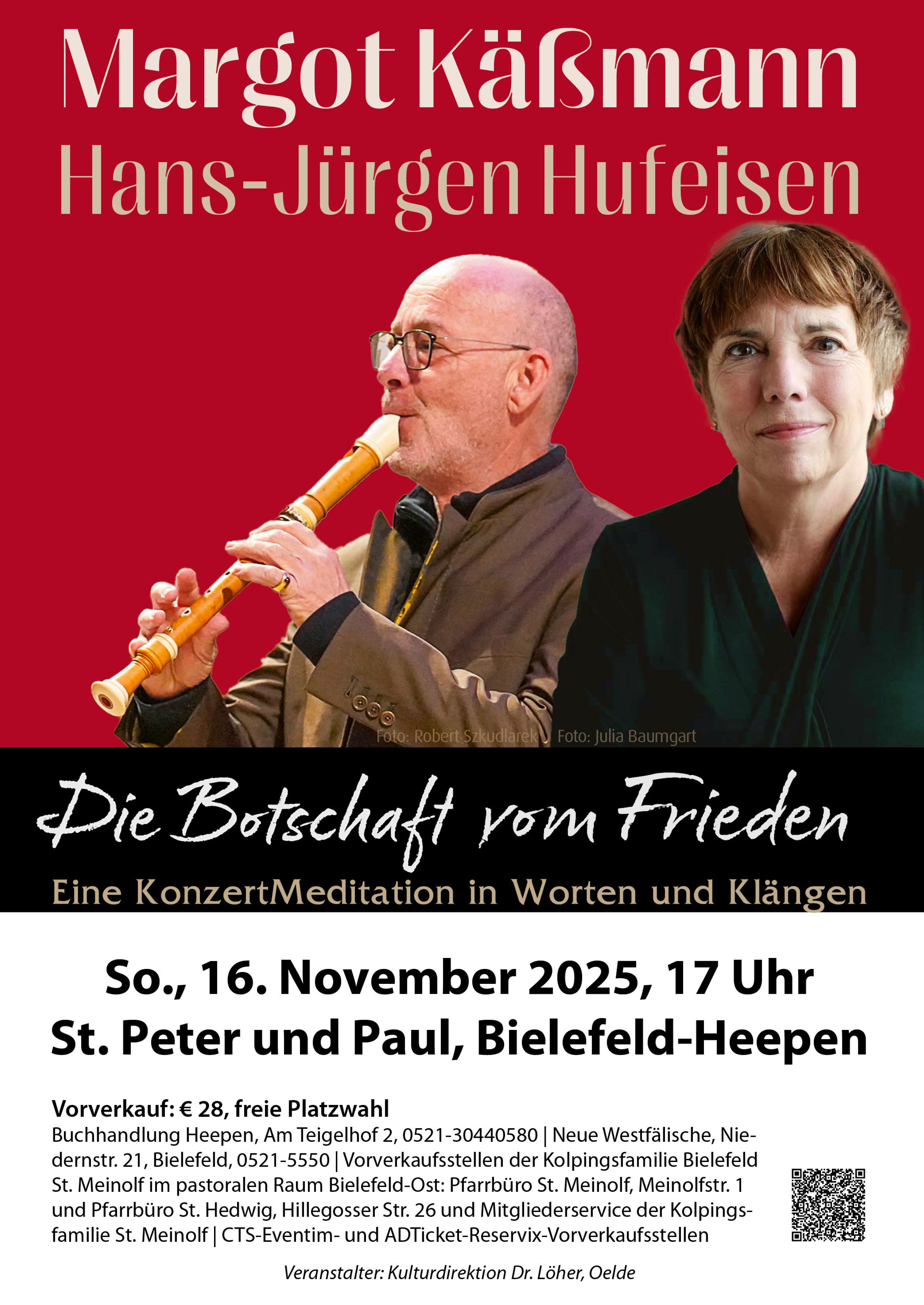 Sonntag, 16.11.2025 17:00 Uhr | Margot Käßmann und Hans-Jürgen Hufeisen: eine Konzertmeditation zum Thema "Die Botschaft vom Frieden" Karten im Vorverkauf zum Preis von 28 € sind erhältlich: Reinhild Neißkenwirth, Tel. 0521 / 31472 Pfarrbüros St.Meinolf / St.Hedwig, Tel. 0521 / 163 988 80 oder per Mail an mitgliederservice@kolping-meinolf.de siehe Plakat | Peter-und-Pauls-Kirche Heepen Heeper Str. 437 |